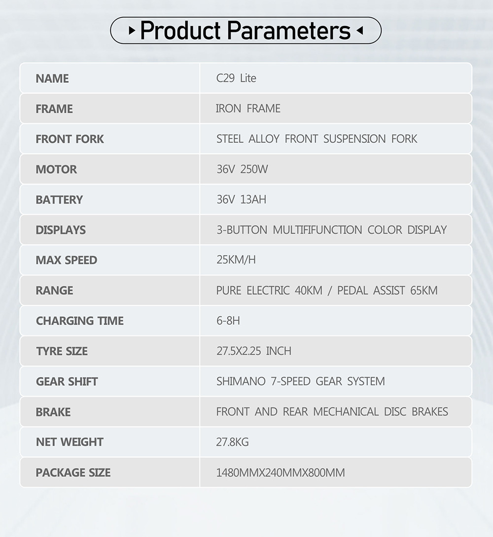 \n\n| Specification | \nMotor: 250W Torque: 43 Nm Battery: 36V 13Ah Charging Time: 6–8 hours Display: 3-button multi-function color display Range: 40km (pure electric), 65km (PAS) Max Speed: 25km/h Max Climbing Angle: 30° Transmission: Shimano 7-speed Brake: Mechanical disc brakes Suspension: Front suspension Fork Tires: 27.5\" x 2.25\" Max Load: 150kg Waterproof: IPX4 Recommended Rider Height: Suitable for riders from 170cm to 200cm | \n