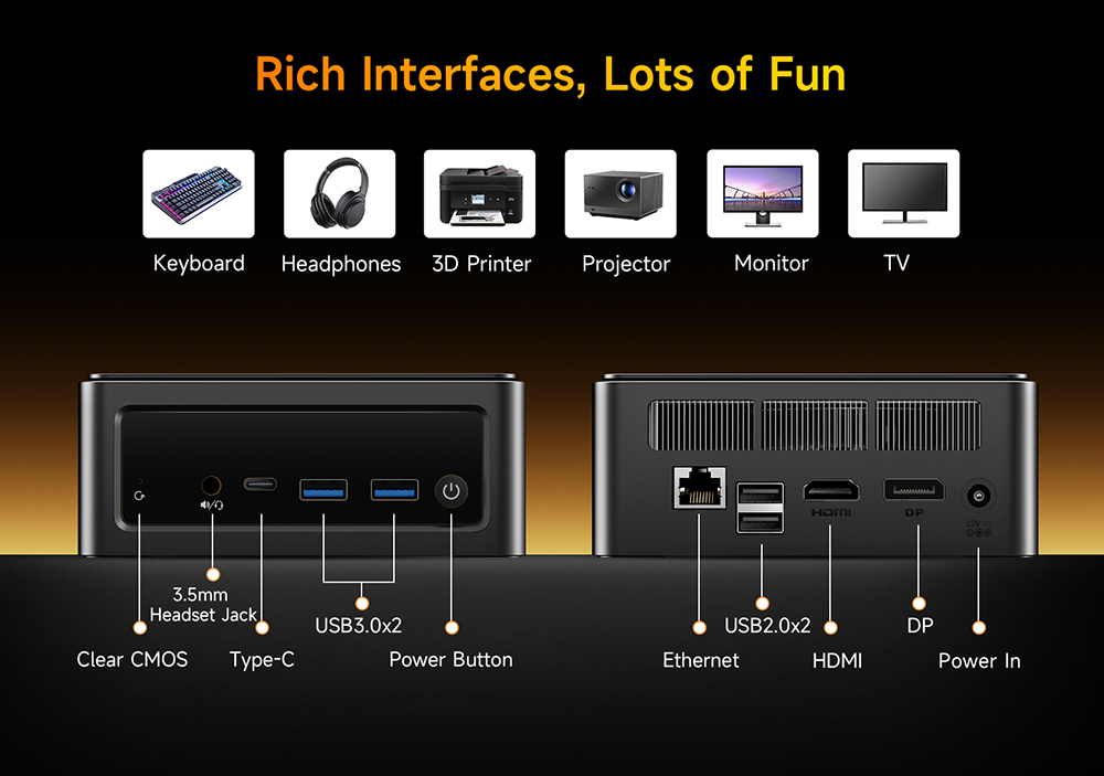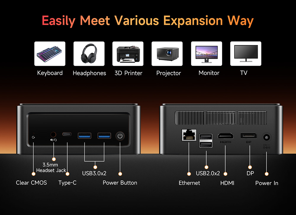 DP, HDMI, Type-C, 2*USB 3.0 porttal, 2*USB 2.0 porttal, RJ45 Gigabit Ethernet porttal és fejhallgató-csatlakozóval felszerelt BMAX B8A Pro mini pc kompatibilis monitorokkal, kivetítőkkel, nyomtatókkal, tévékkel, és még sok más, különféle munka- és szórakoztatási igények kielégítésére.