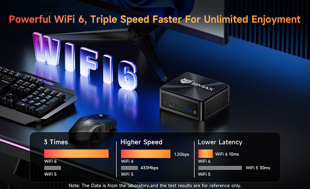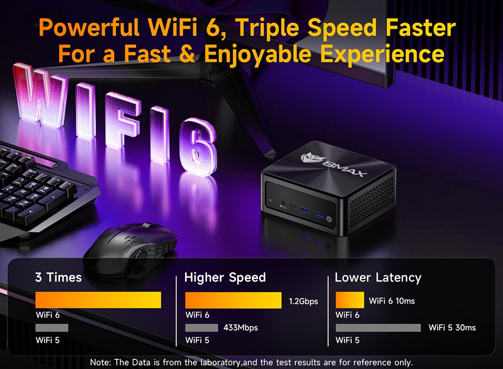 \nTámogatja a WiFi 6-ot akár háromszoros sebességgel és legalacsonyabb késleltetéssel.A Bluetooth 5.2-vel kombinálva a BMAX B8A Pro mini asztali számítógép gyorsabb és stabilabb kapcsolatot kínál vezeték nélküli fejhallgatókhoz, billentyűzetekhez és játékvezérlőkhöz, tökéletes munkához és szórakozáshoz egyaránt.