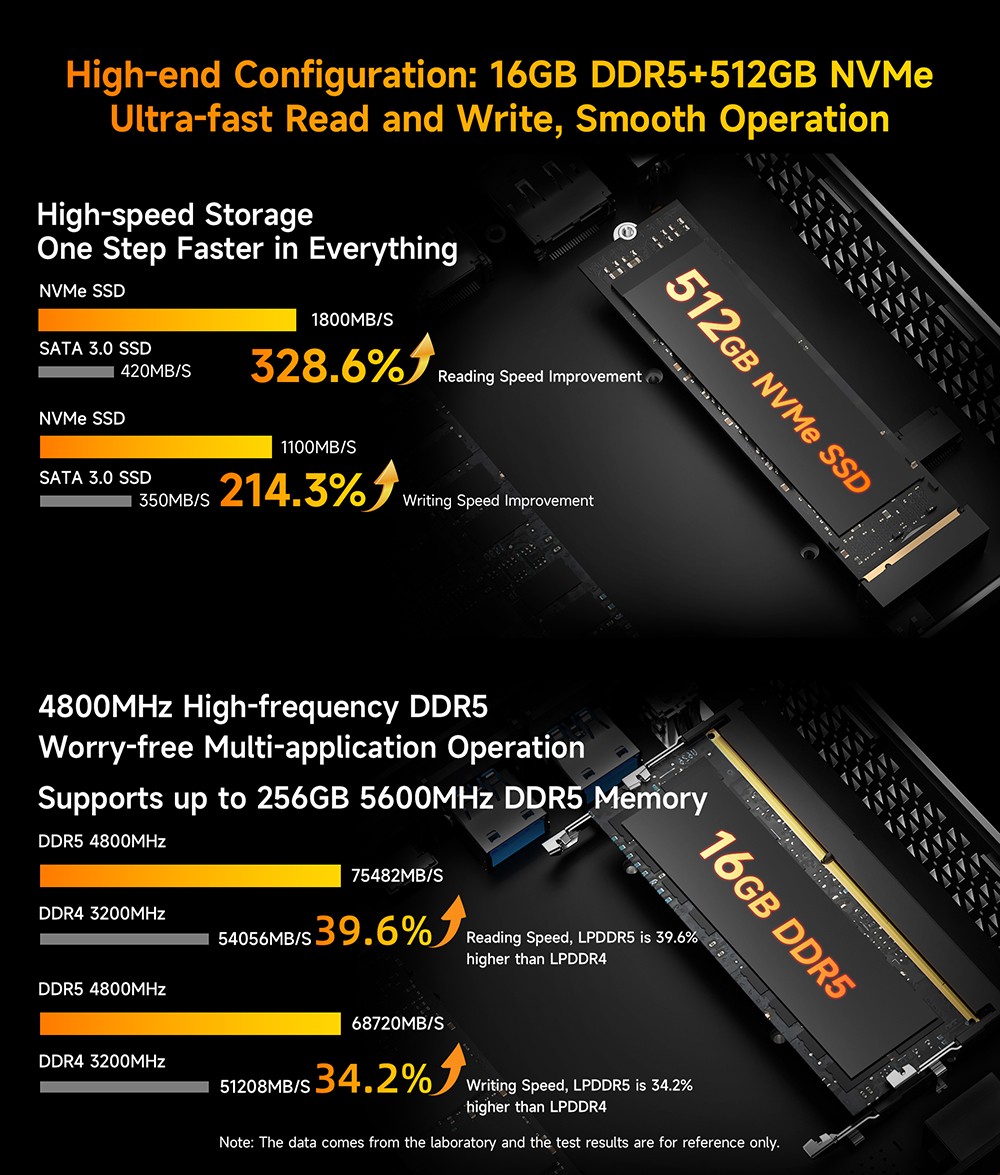 A 16 GB DDR5 RAM-mal és 512 GB NVMe SSD-vel felszerelt BMAX B8A Pro mini számítógép villámgyors olvasási és írási élményt nyújt.Akár 256 GB DDR5 memória támogatásával könnyedén kielégíti a professzionális alkotás, adatelemzés és játék igényeit.