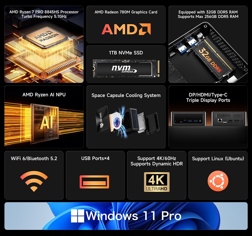 \n\n| Specifikáció | \n\n CPU: AMD Ryzen 7 Pro 8845HS CPU platform: AMD Ryzen AI Mag/ Szálak: 8/16 Frekvencia: Alap 3,8 GHz, Burst 5,1 Hz GPU: AMD Radeon 780M RAM: 32 GB SO-DIMM/DDR5/4800MHz (max. 256 GB) SSD: 1 TB NVMe SSD Előre telepített operációs rendszer: Windows 11 WiFi: WiFi 6 Bluetooth: 5.2 LAN: 2,5 Gbps \n Interfész: 1 x DC 1 x 3,5 mm-es fejhallgató-csatlakozó 2x USB 3.0 2x USB 2.0 1x HDMI 2.1 1 x DP 2.1 1 x teljes funkcionalitású Type-C 1 x RJ45 \nHűtőrendszer: intelligens ventilátor + két réz hőcső \n | \n