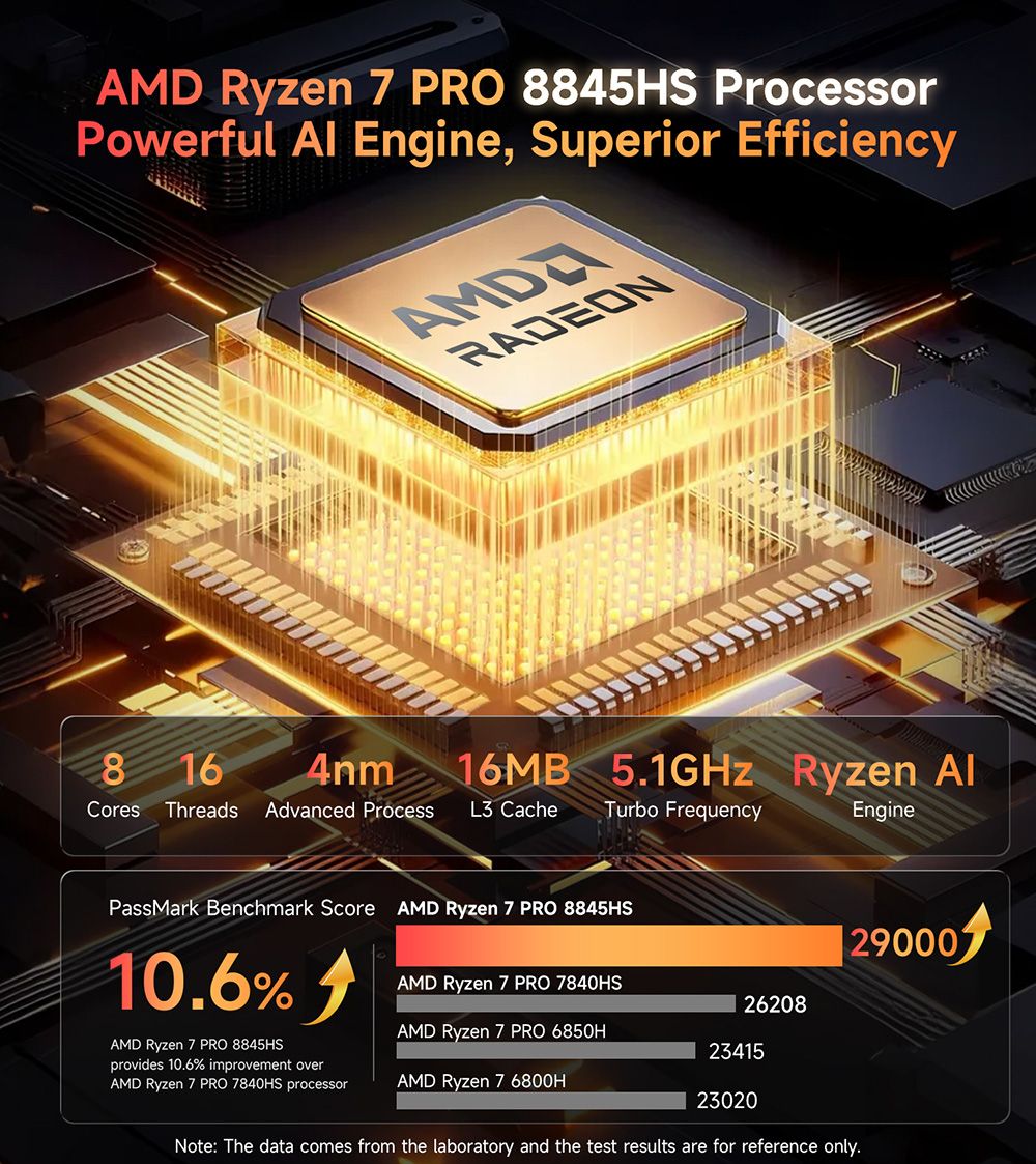 \nAz AMD Ryzen 7 PRO 8845HS 8 magos, 16 szálas processzorral működik, amely egy 4 nm-es fejlett eljáráson épül, akár 5,1 GHz-es turbófrekvenciával.Ez az integrált CPU, GPU és NPU soha nem látott mesterséges intelligencia számítási teljesítményt nyújt, vezetve az intelligens számítástechnika új trendjét.