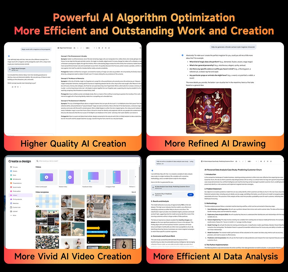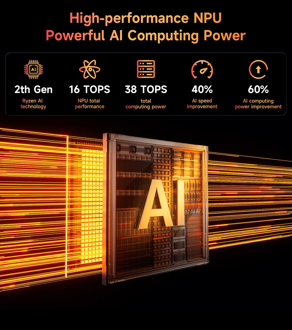 \nA beépített AMD Ryzen AI NPU neurális hálózati processzor támogatja a második generációs Ryzen AI technológiát, akár 16 TOPS NPU teljesítményt és 38 TOPS kombinált számítási teljesítményt biztosítva.Az AI algoritmus optimalizálása több mint 40%-kal felgyorsul, jelentősen javítva az intelligens jelenetfelismerést, a képfeldolgozást és a kreatív termelékenységet.
