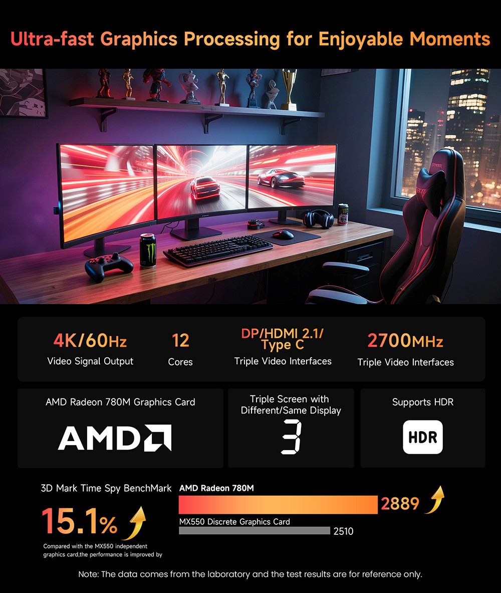 \n12 magos AMD Radeon 780M GPU-val működik, akár 2700MHz-es órajellel, és támogatja a hármas 4K/60Hz videokimenetet.A többképernyős szinkronizálás vagy a független megjelenítés DP, HDMI 2.1 vagy Type-C interfészen keresztül támogatott, így magával ragadó vizuális élményt és tökéletes termelékenységet biztosít.