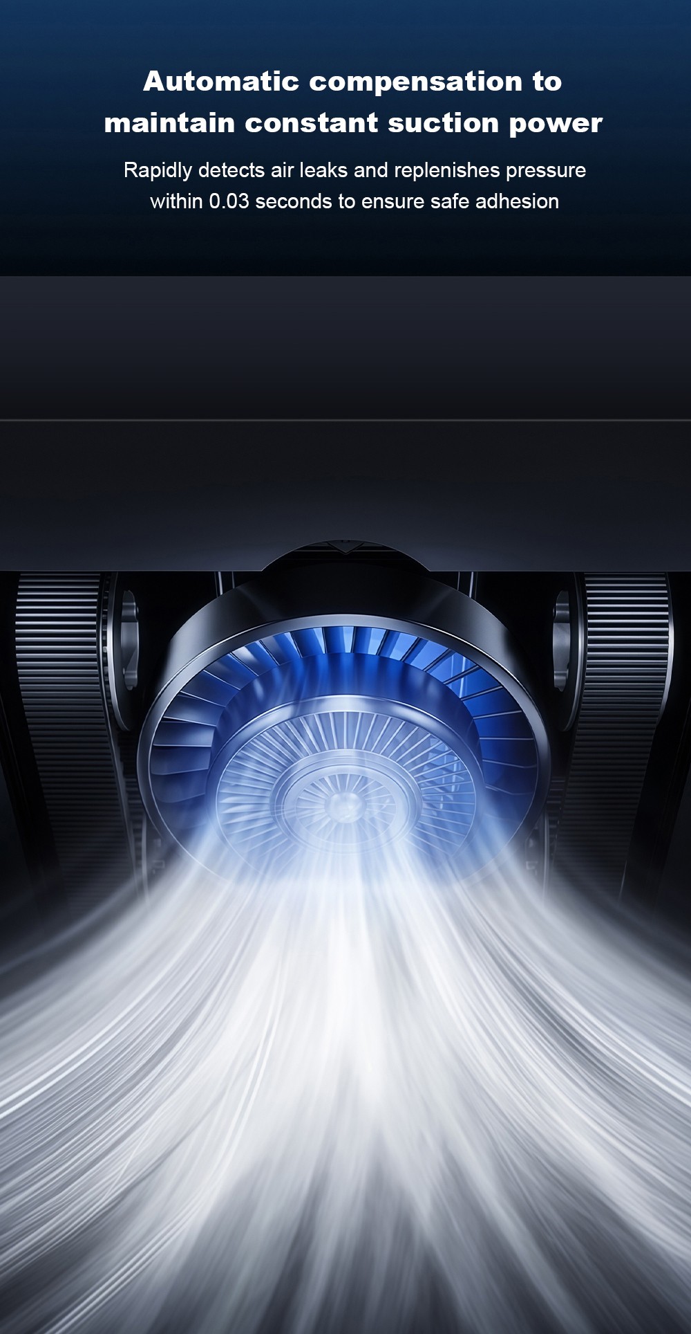 \nBietet starke Saugkraft für stabile Haftung und gründliche Reinigung.Ausgestattet mit Luftleckerkennung, Backup-Batterie (30 Minuten Haltezeit) und einem langen Sicherheitsseil, um vollständige Sicherheit auch bei Stromausfällen oder unerwarteten Situationen zu gewährleisten.