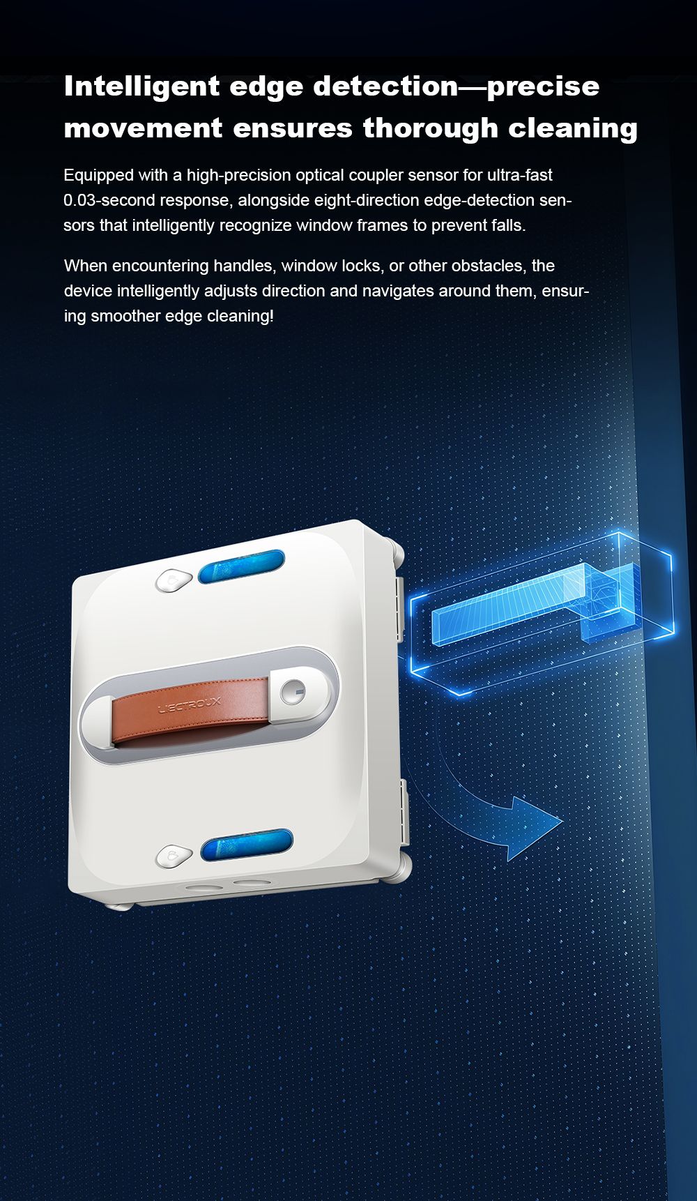 \nBuilt-in 8 micro switches at all corners enable flexible edge recognition, preventing the robot from going beyond window borders. The separate air duct design also helps extend the robot’s lifespan.