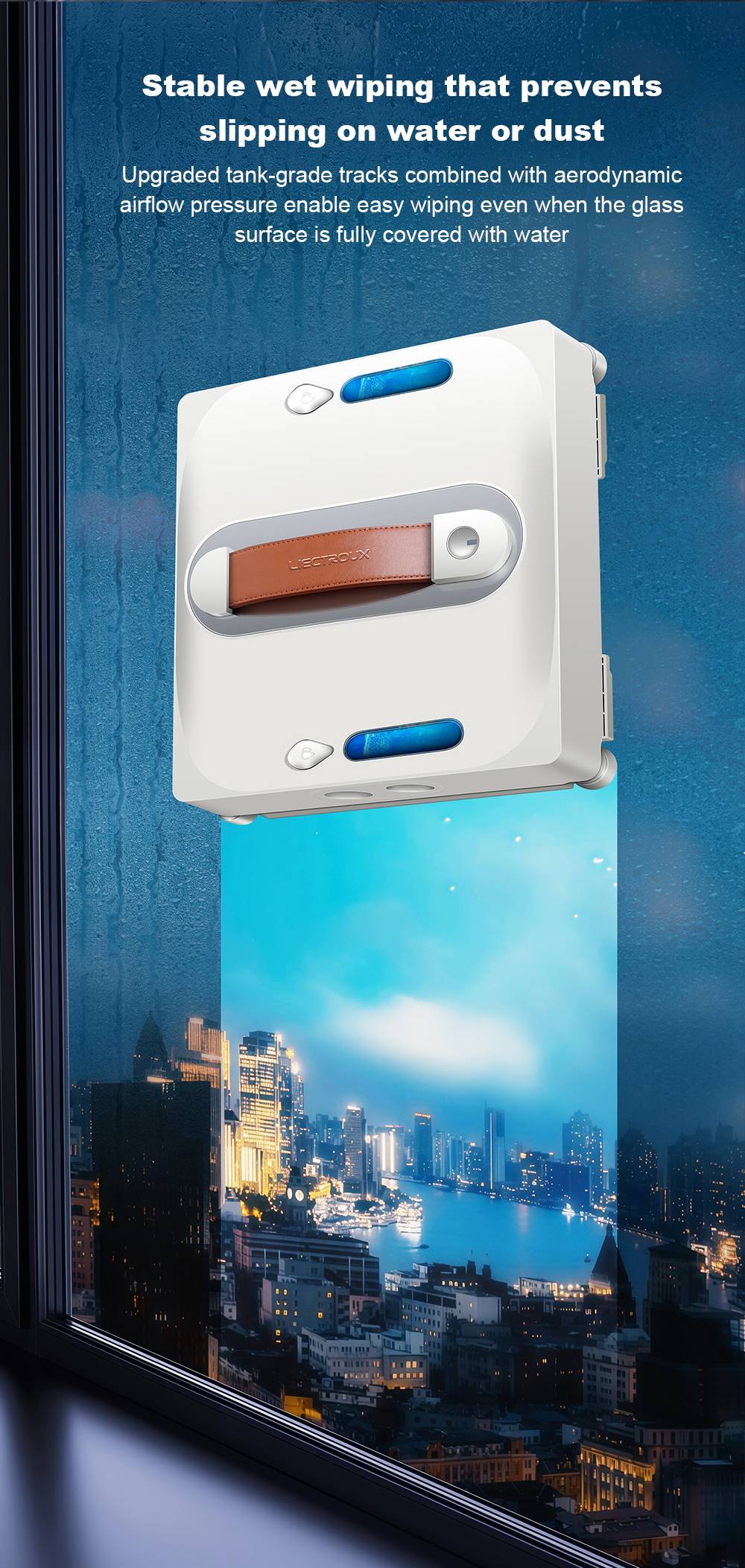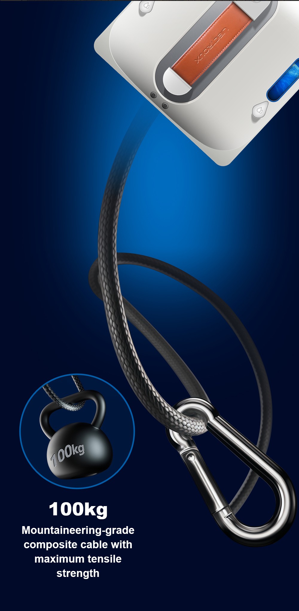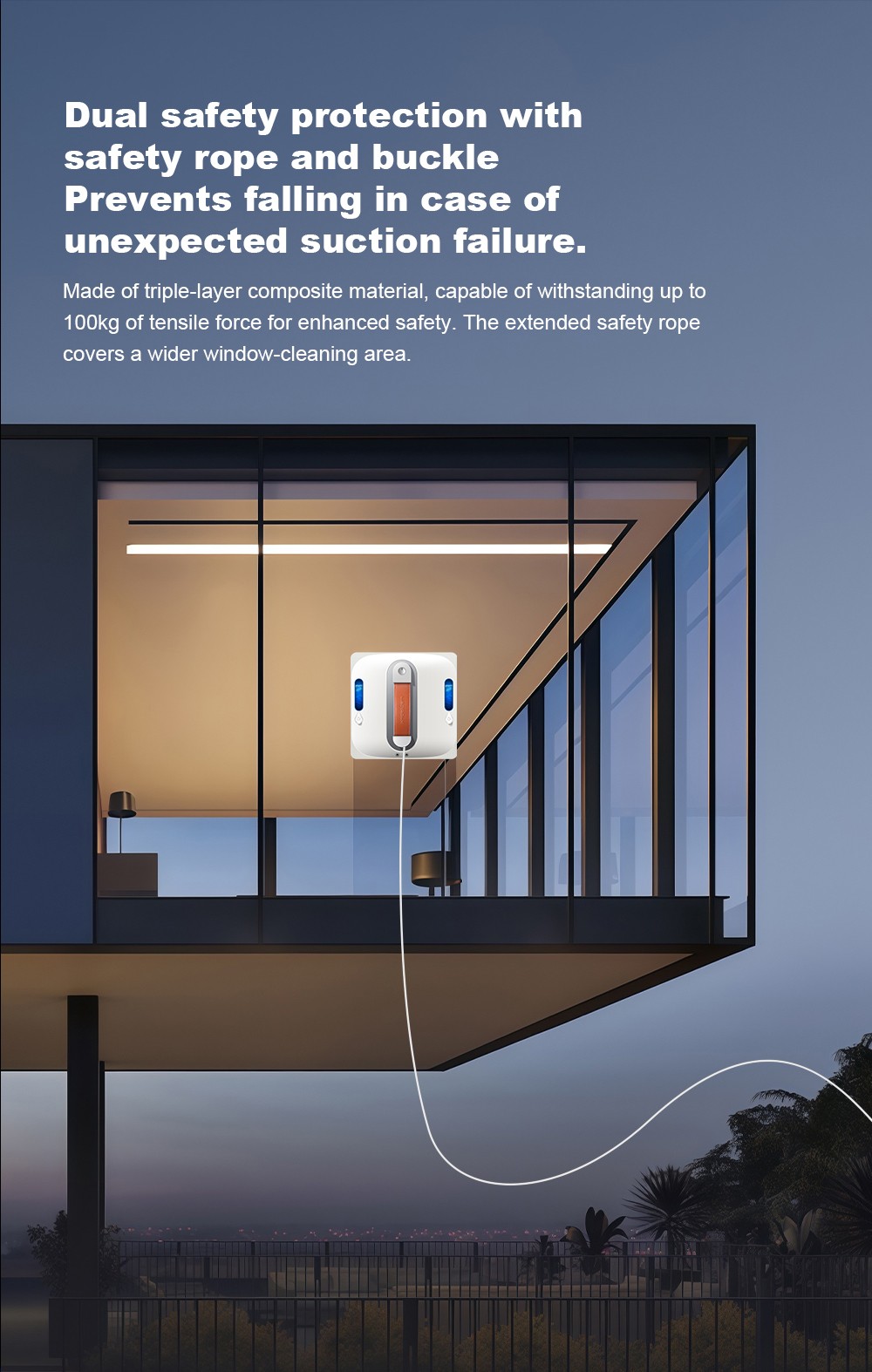\nDelivers strong suction for stable adhesion and deep cleaning. Equipped with air-leak detection, backup battery (30 mins hold time), and a long safety rope to ensure complete safety even during power outages or unexpected situations.