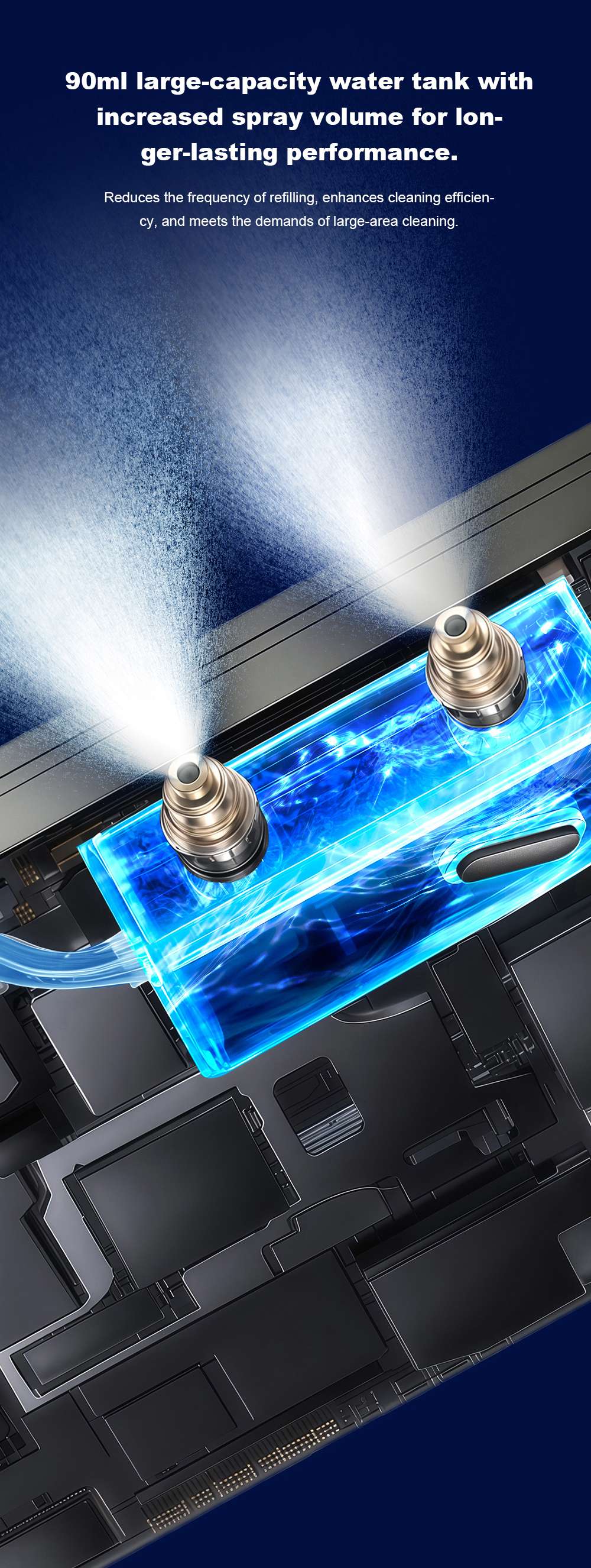 \n\n| Spezifikation | \n\n Batteriekapazität: 500 mAh Li-Ion Intelligente Steuerung: APP Intelligente Steuerung Fassungsvermögen des Wassertanks: 90 ml Saugleistung: 8000Pa Reinigungsmodus: 4 Typen Sprühmodus: Automatisch/Manuell \n | \n