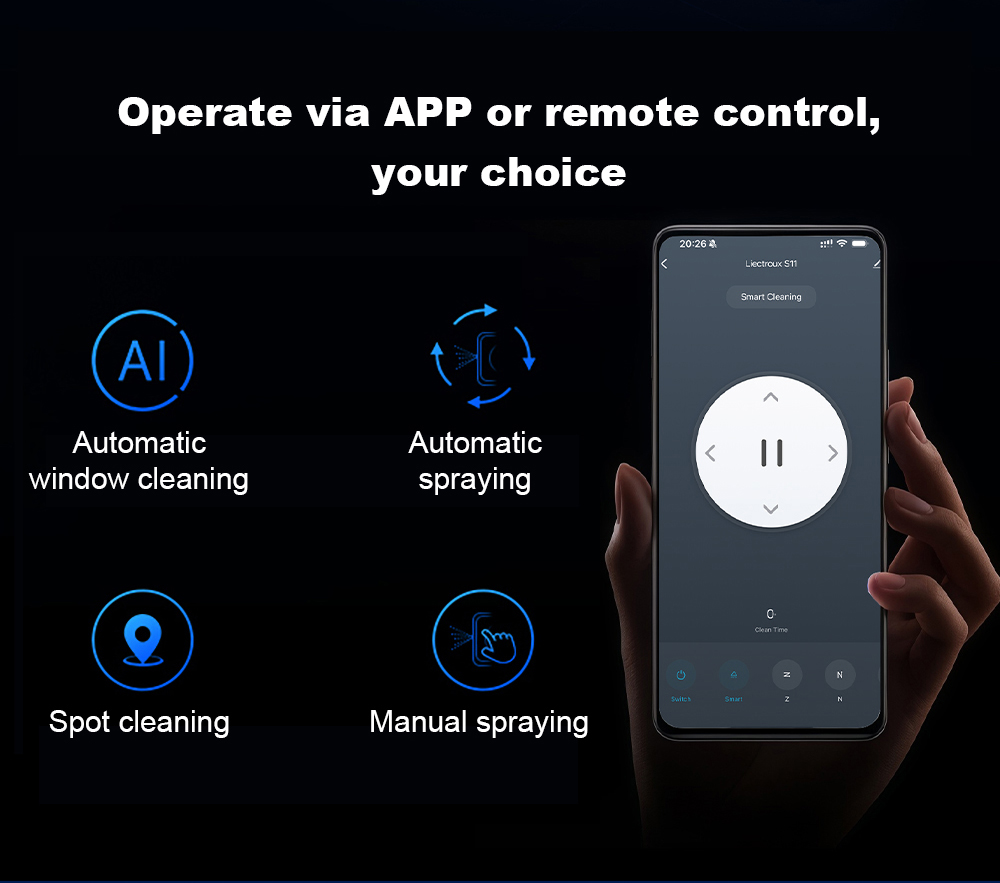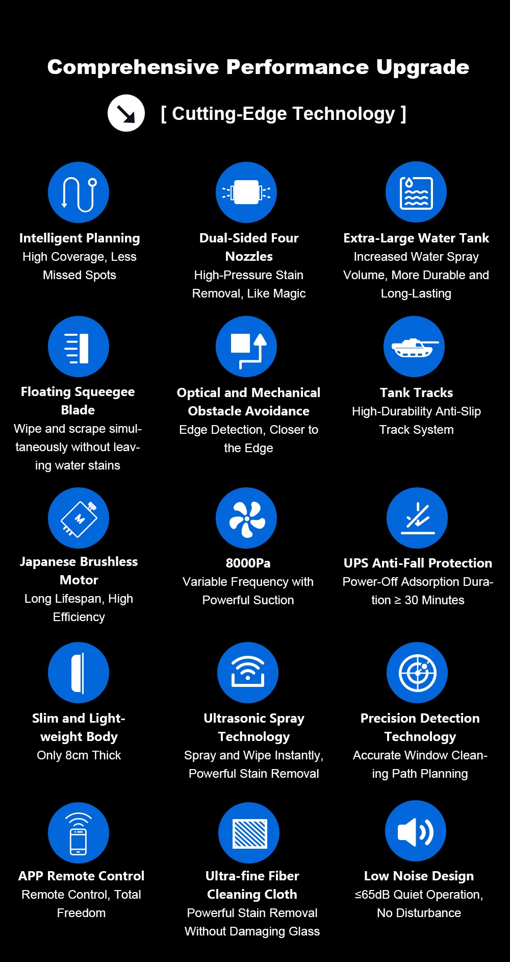 \nAutomatically adjusts suction power based on glass type. Gyroscope navigation supports Z-shaped, N-shaped, Edge, and Spot cleaning paths for full coverage and efficiency.