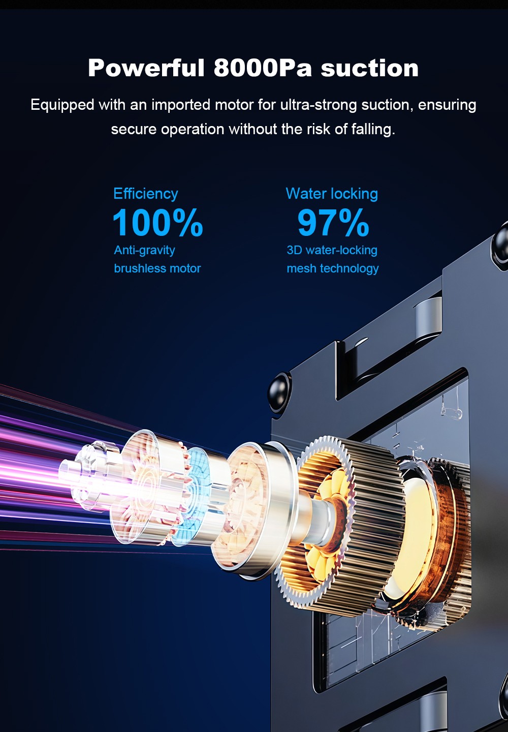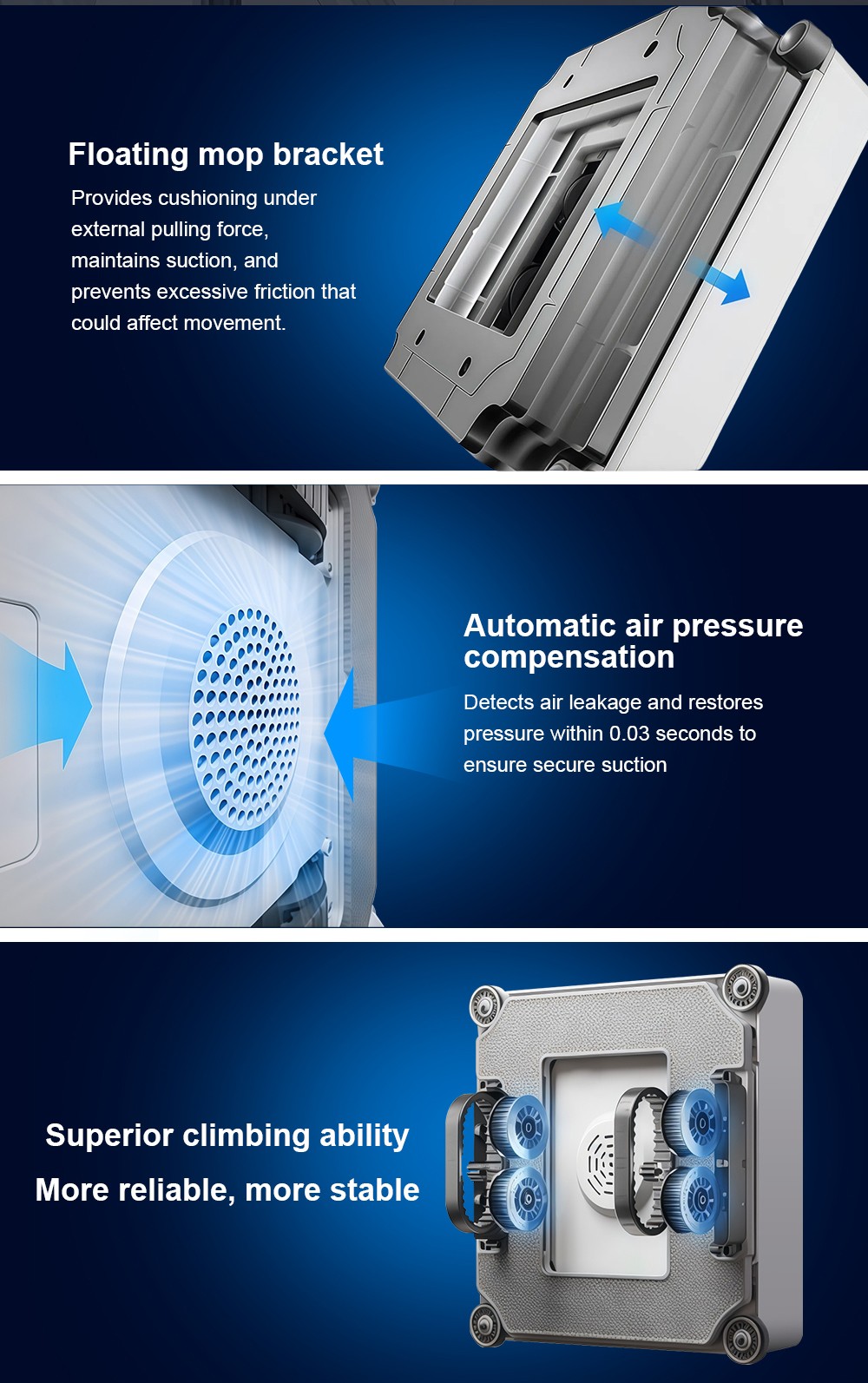 \nOffre une forte aspiration pour une adhérence stable et un nettoyage en profondeur.Équipé d'une détection de fuite d'air, d'une batterie de secours (temps de maintien de 30 minutes) et d'une longue corde de sécurité pour assurer une sécurité totale même en cas de coupures de courant ou de situations inattendues.