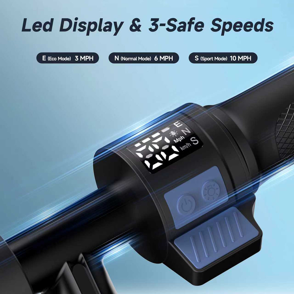 A K2 Pro gyerek elektromos robogó három sebességi módot kínál: E (Eco mód 5 km/h), N (normál mód 10 km/h) és S (Sport mód 15 km/h), amelyek különböző korú és lovaglási képességű gyermekek számára készültek, biztonság és élvezet.