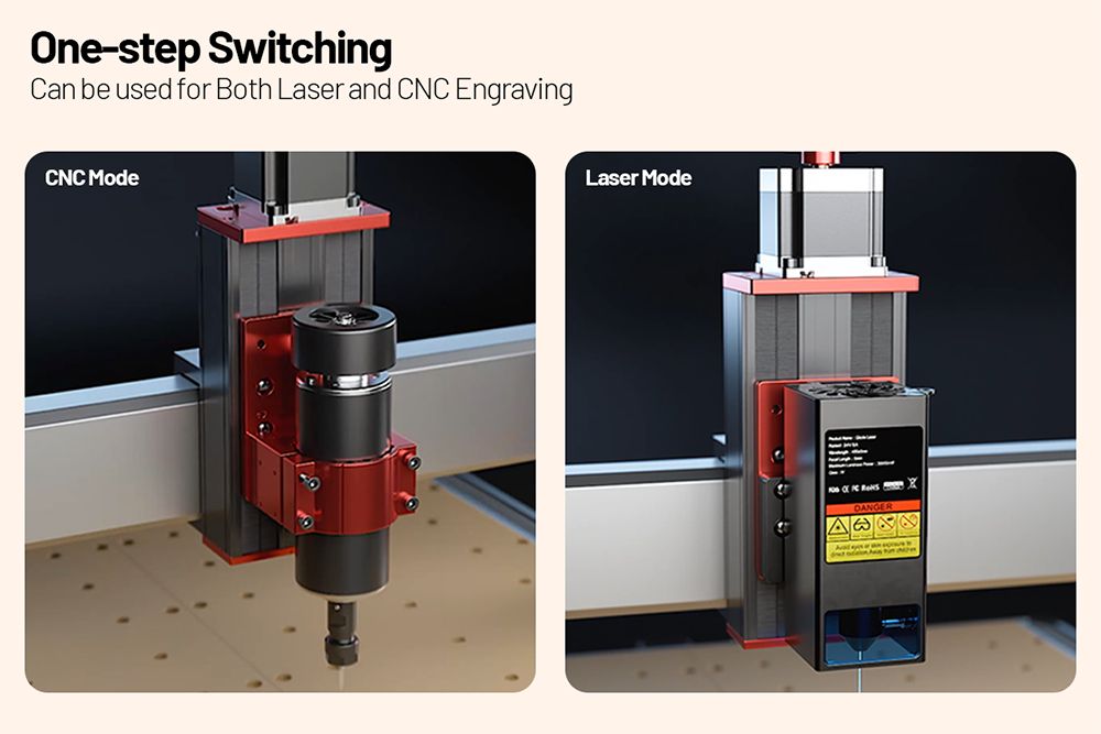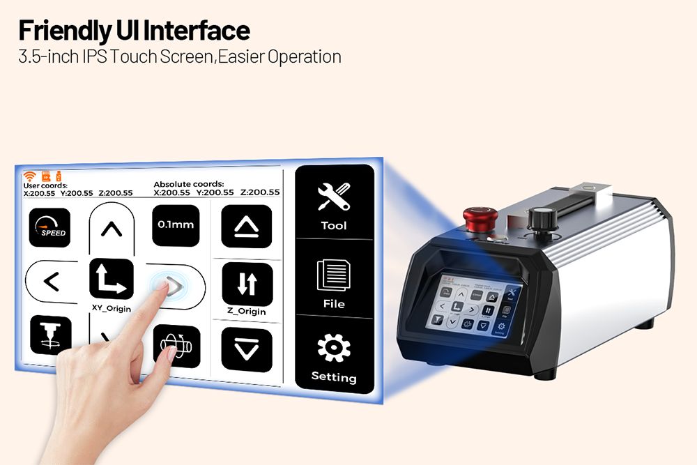 \nDesigned for flexibility and control, this machine supports offline, wireless, and APP operation, while the XYZ handwheel enables precise manual adjustment and the adjustable feet ensure easy leveling. It offers dual-mode functionality, allowing users to seamlessly switch between CNC and laser engraving modes (laser module sold separately). The 3.5-inch IPS touch screen provides an intuitive and responsive interface for effortless operation.