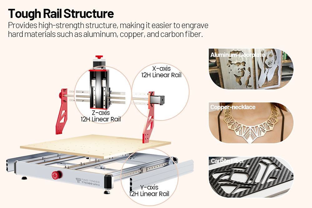 \nEquipped with a 500W high-efficiency spindle, this CNC engraving machine delivers powerful cutting performance and improves metal processing efficiency by up to 40%. With precision engineering of ±0.05mm, it ensures smooth, burr-free surfaces and professional-quality results. Supporting over 10 materials—including aluminum, wood, and acrylic—it meets a wide range of creative and industrial needs. Its robust structure, featuring 12H linear guides on the X/Y/Z axes, provides high stability and allows engraving on hard materials such as aluminum, copper, and carbon fiber.