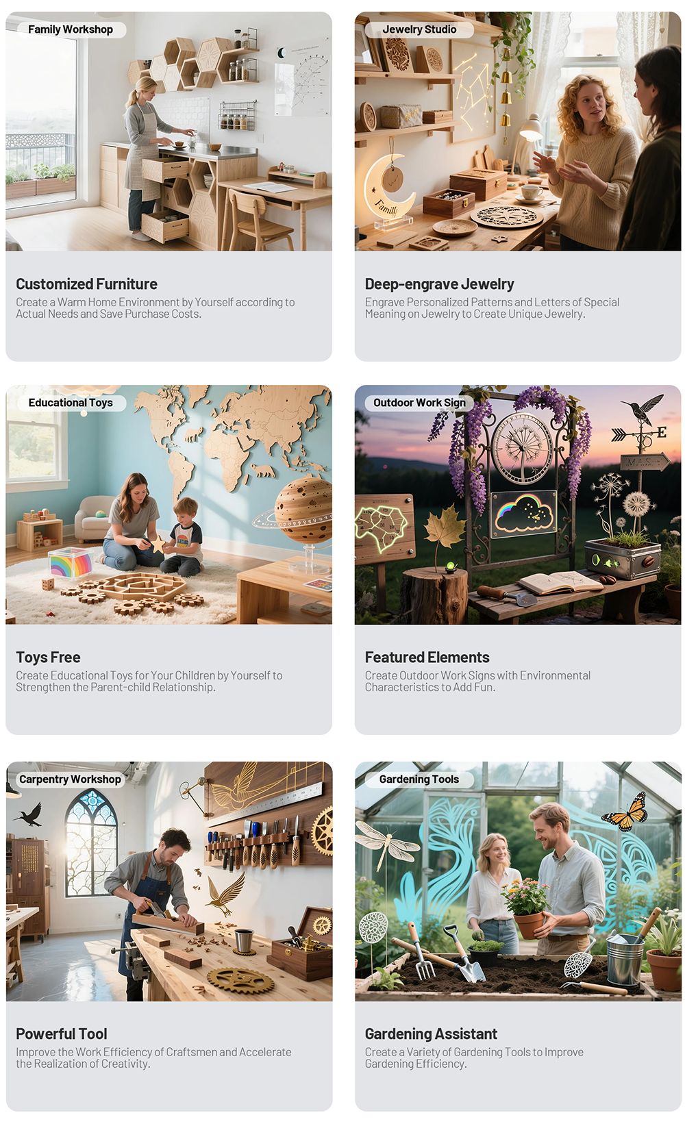 \nDiese CNC-Graviermaschine unterstützt eine Vielzahl optionaler Zubehörteile wie Staubsauger und Graviermodule, was mehr Flexibilität für kreative Projekte bietet.Es eignet sich perfekt für verschiedene Anwendungen, einschließlich maßgefertigter Möbel, Schmuckgravuren, Holzarbeiten, Lernspielzeug, Beschilderungen und DIY-Bastelarbeiten – ideal sowohl für professionelle Werkstätten als auch für persönliche Makerspaces.