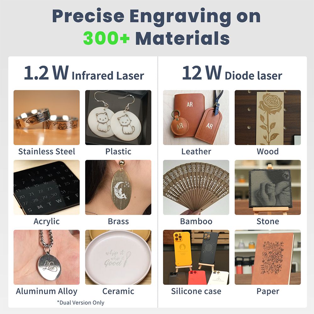 \nIt adopts the 12 W diode laser with a fine 0.06 mm laser spot, offering an excellent balance between cutting efficiency and engraving precision. In addition, it supports a maximum working area of 150 x 150 mm and a maximum processing height of 80 mm, meeting most of your creation needs.