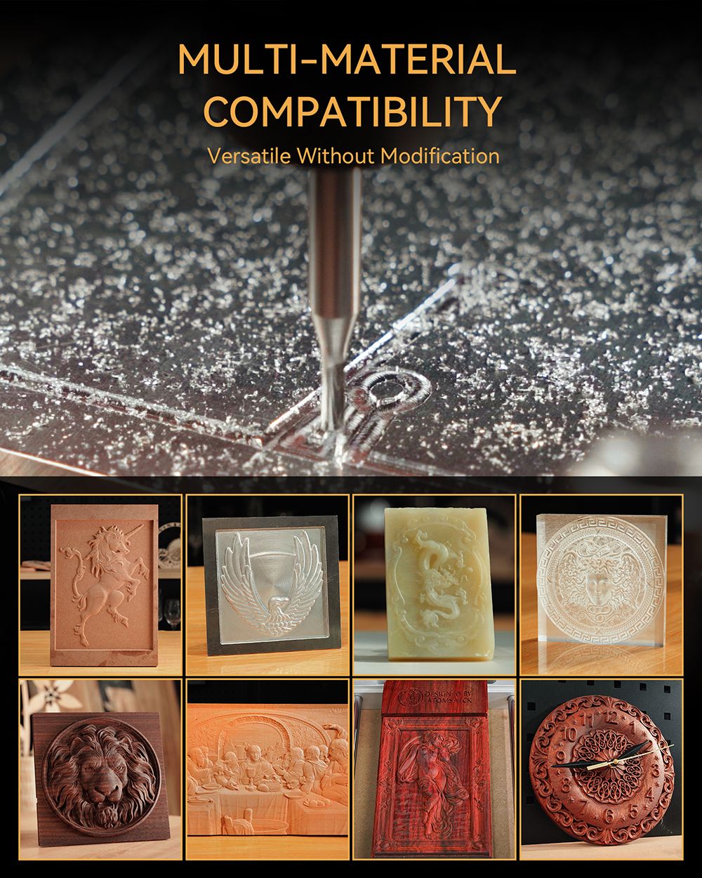 \nThe 12,000 RPM high-power spindle handles wood, aluminum, brass, acrylic, PVC, POM, and PCB with ease — perfect for woodworking, PCB production, and metal engraving.