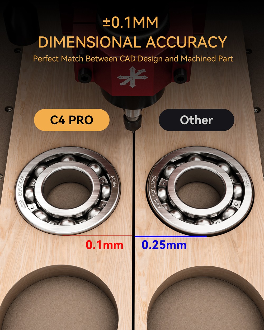 \nConstruit avec des guides linéaires MGH12 et des vis à billes à double écrou, le C4 Pro atteint une vitesse de gravure jusqu'à 2000 mm/min — réalisant une jointure en laiton en seulement 15 minutes avec une grande précision et rigidité.