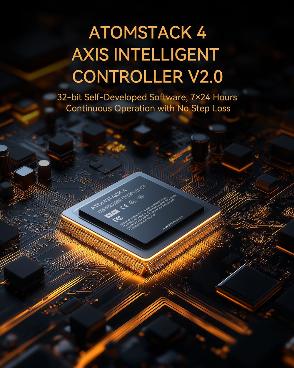 \nEquipped with the self-developed ATOMSTACK 4AXIS Intelligent Controller V1.0, supporting 24/7 continuous work, 4-axis linkage, 4-point centering, precision calibration, and software limit protection for safer, smarter machining.