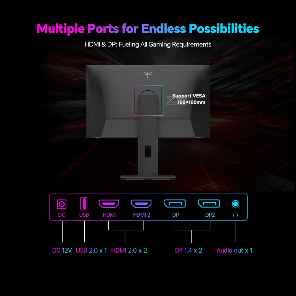 This gaming monitor is equipped with dual HDMI 2.0 ports, dual DP 1.4 ports and one output port (headphone), supporting high resolution and ultra-fast refresh rates to ensure high-quality audio and video transmission, and can easily connect to multiple devices.