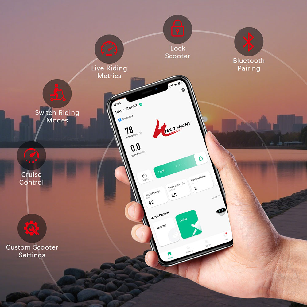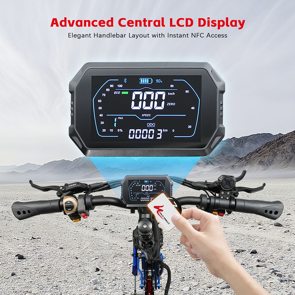 \nEquipped with an LCD central display and NFC unlocking, it displays real-time information such as speed, battery level, mileage, and gear position. Bluetooth connectivity enables intelligent features such as vehicle locking, cruise control, mode switching, custom settings, and music playback, making riding more convenient and enjoyable.
