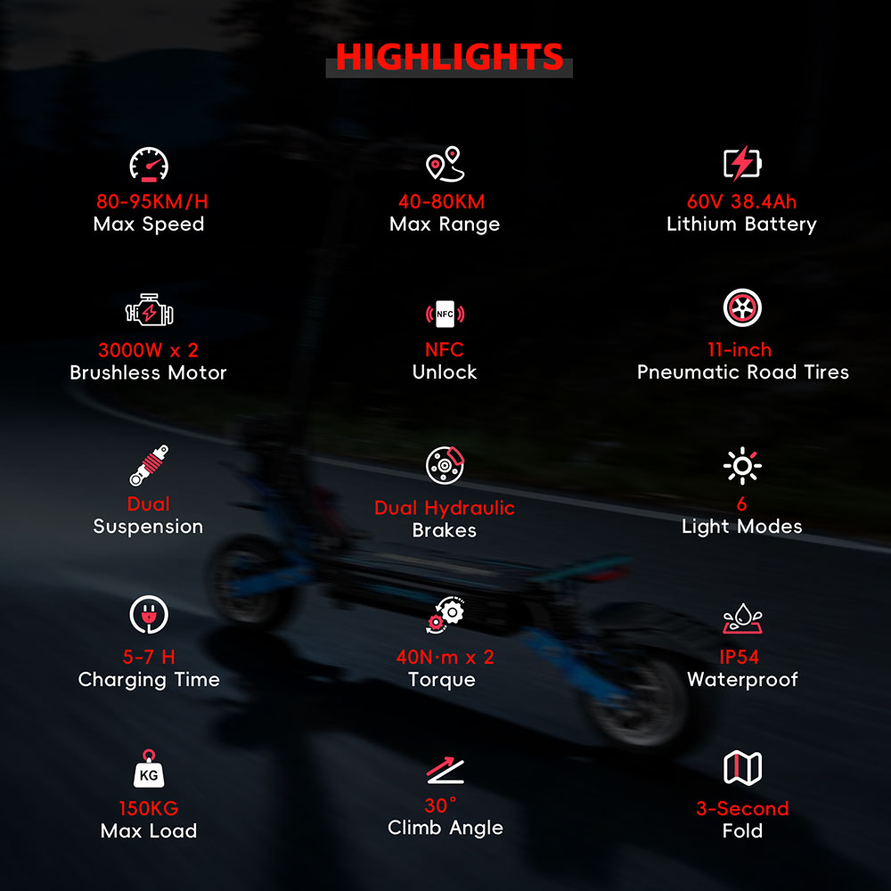 | Specification | \nMax Speed: 80-95km/h Speed Level: 3 Range: 40-80km Max Load: 150kg (330lbs) Recommended Rider Height: 150-200cm (4'11\"–6'7\") Climb Angle: 30° Waterproof: IP54 Battery: 60V 38.4Ah Lithium Battery Motor: Brushless Motor Max Power: 2 x 60V 3000W Charger: 60V 3A Charging Time: 5-7 Hours Brake: Front and Rear Hydraulic Brakes Brake Distance: ≤4m Front Suspension: Front Spring Suspension Rear Suspension: Rear Spring Suspension Steering Damper: Yes Display: LCD Central Display + NFC Bluetooth: Bluetooth Pairing, Lock Scooter, Live Riding Metrics, Switch Riding Modes, Cruise Control, Custom Scooter Settings, Play Music Front Light: Yes Rear Light: Yes Brake Light: Rear Brake Lights Turning Light: Front and Rear Turn Signals RGB Light: Yes Branding Light: Yes Frame: Aluminum Alloy Tire: 11-inch Pneumatic Road Tires Recommended Tire Pressure: 3.4bar (50PSI) | \n