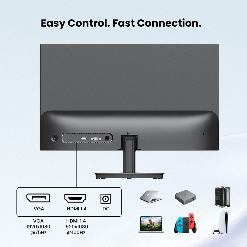 \nDieser H24B9-Monitor verfügt über einen VGA-Anschluss, einen HDMI 1.4-Anschluss und einen DC-Anschluss und erfüllt damit die täglichen Büroanforderungen mit stabilen und schnellen Verbindungen zur Steigerung Ihrer Produktivität.