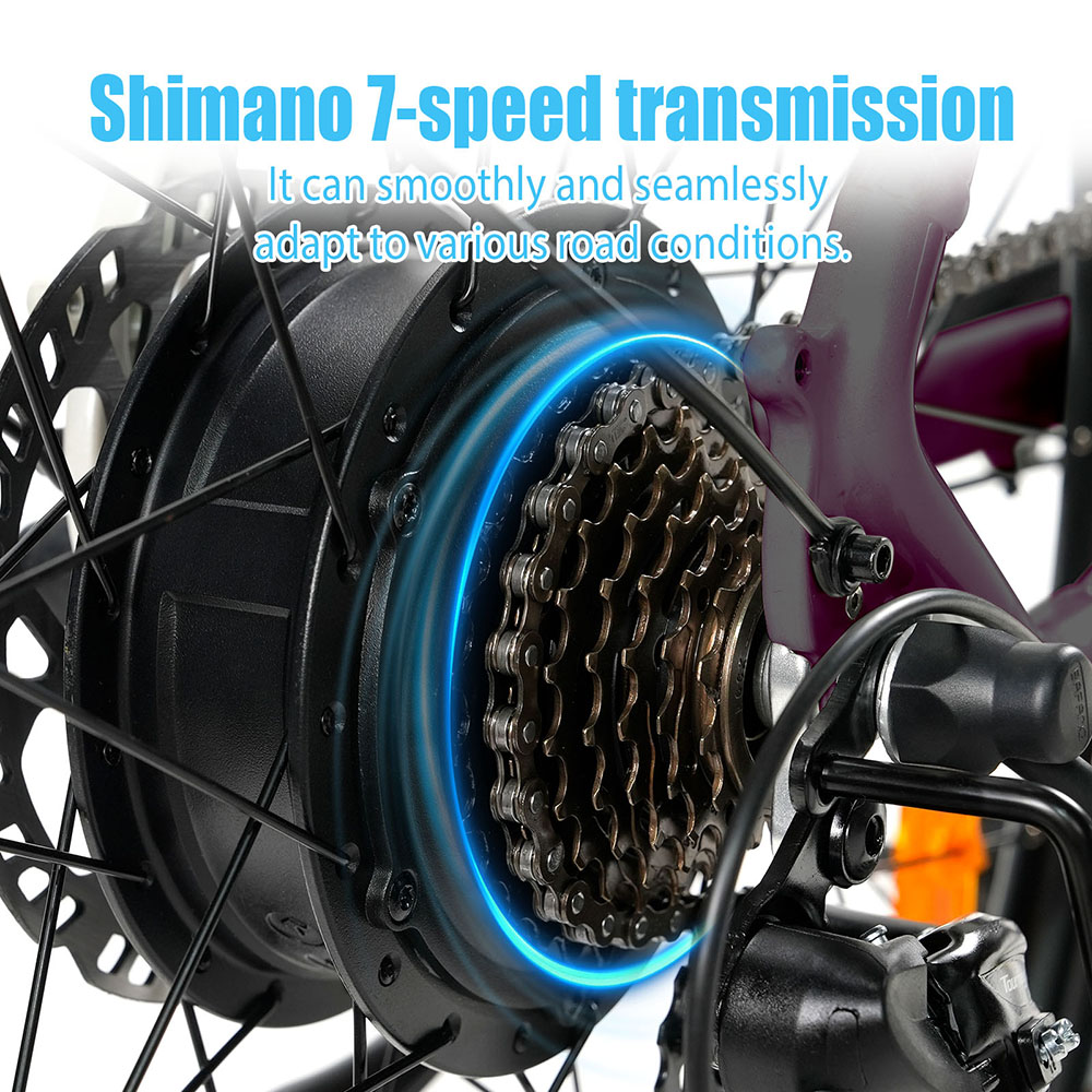 \nThe reliable and durable Shimano 7-speed transmission system offers smooth shifting, easily handling uphill driving, flat-road cruising, and rapid acceleration, making every road condition more manageable.