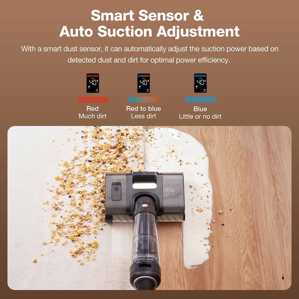 \nWith a smart dust sensor, the PW11 Pro Max can automatically adjust the suction power according to the dust detected for optimal power efficiency. The water spray can be controlled automatically or manually. Switching to the manual water control allows you to spray more water on stained and dirty floors with stubborn ground-in dirt and less water on less stained floors for efficient use of water.