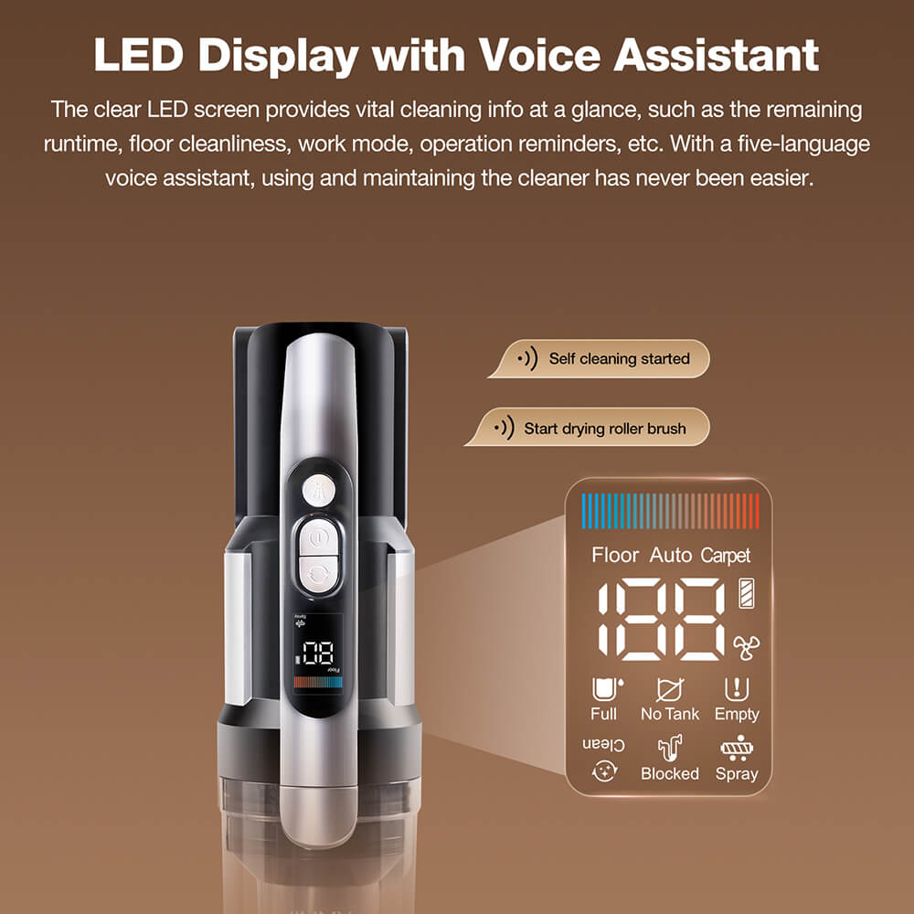 \n\n| \n Features \n | \nLED Display: YES Dust Sensor: YES Handheld Vacuum: YES Carpet Brushroll: YES (With Metal Tube) Electric Mattress Head: YES Brushroll Air-Drying Function: YES Self-Cleaning System: YES Voice Assistant: YES (5 Languages) Water Spray Control: YES (Auto & Manual) | \n